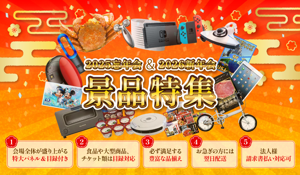 忘年会・新年会にぴったりの景品ランキング&特集をご紹介いたします。