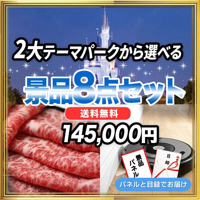 他の画像を見る 景品8点145,000円セット 内容:選べる2大テーマパークペアチケット,TDL他・ルンバ・神戸牛・こだわりの松阪牛100%コロッケ(10セット入り)・空気清浄機など 目録・パネル付き 販売価格 ¥ 145,000 税込 お気に入りに登録する